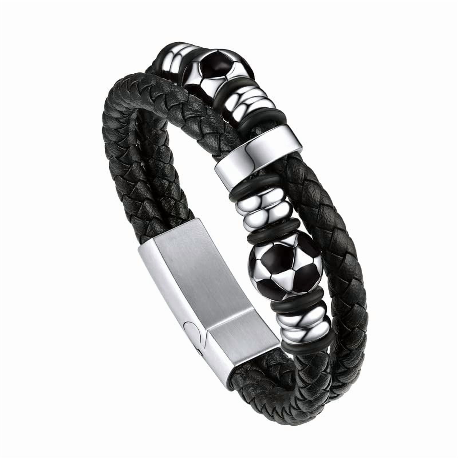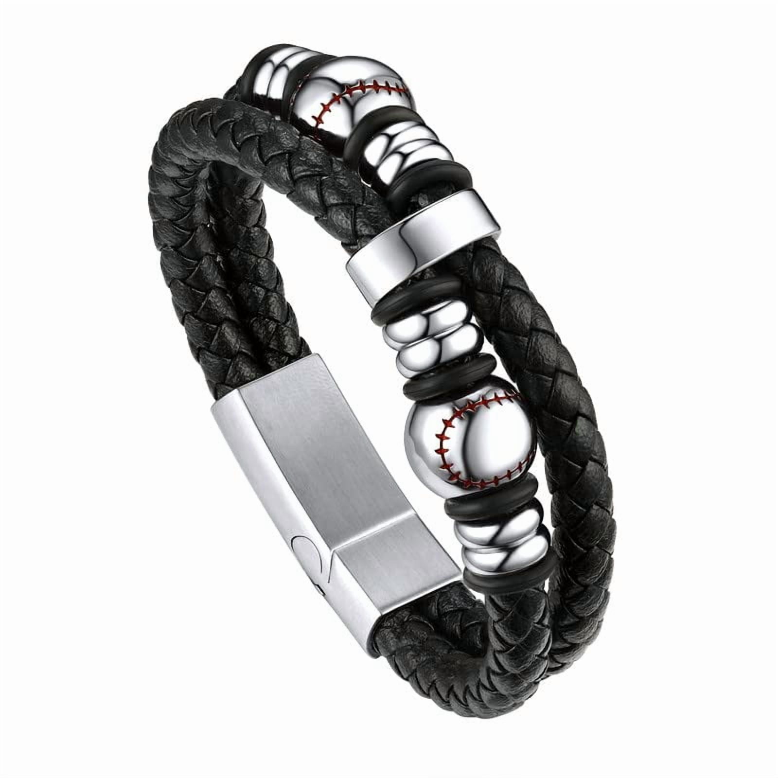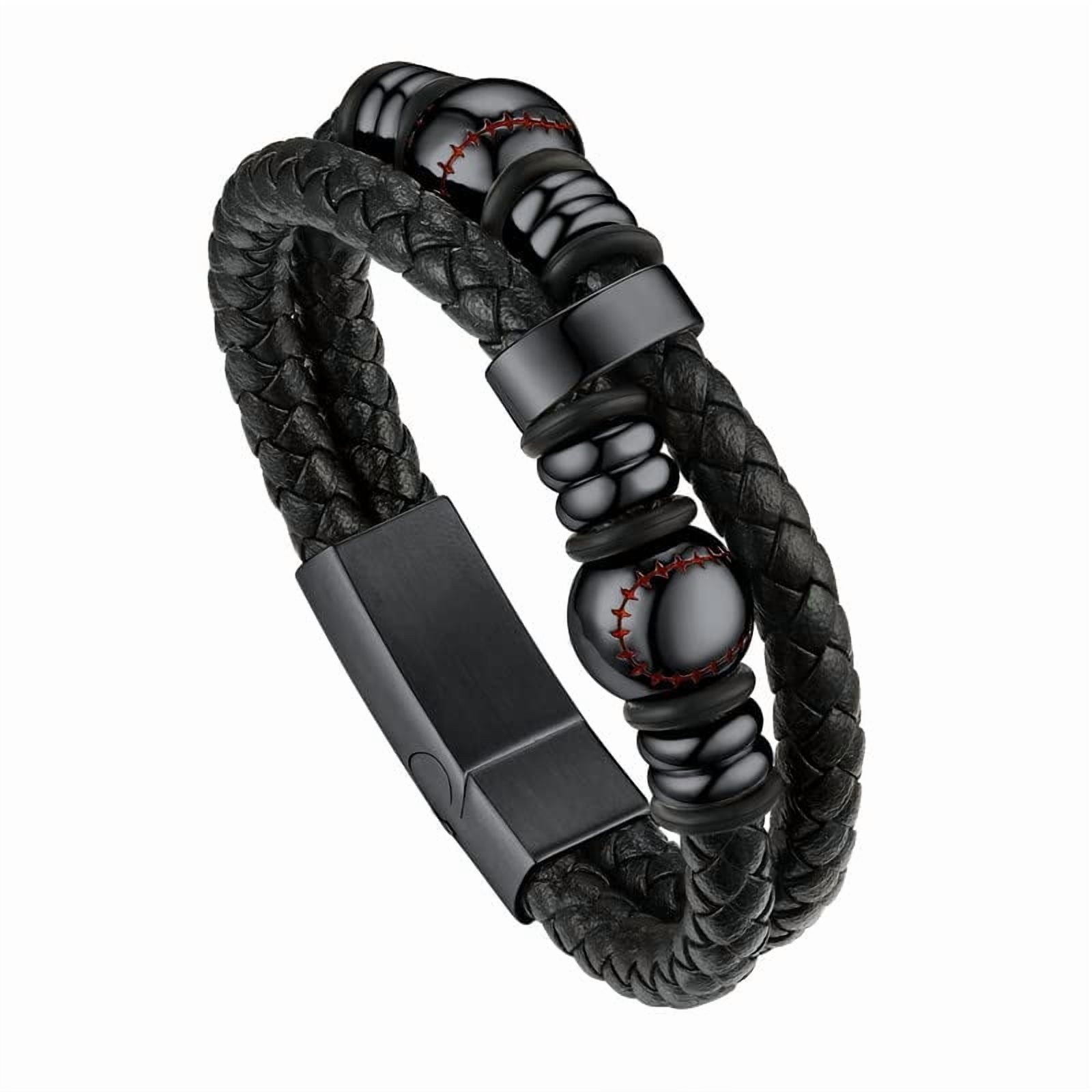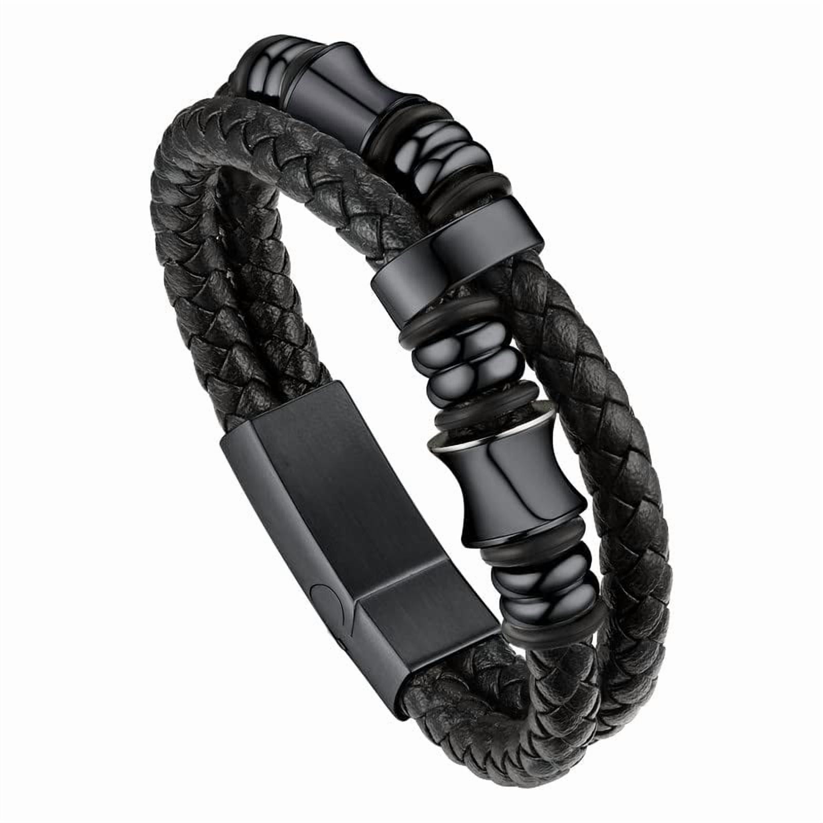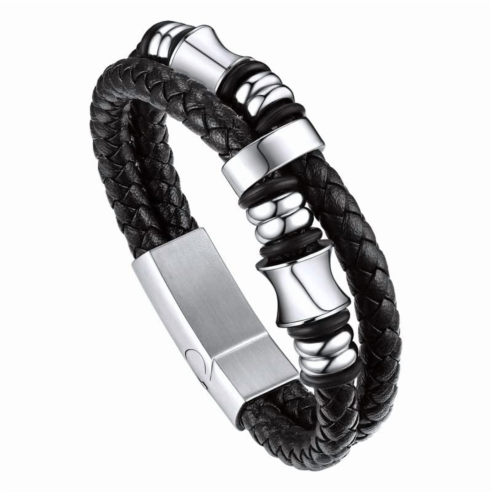 Bandmax Men's Stainless Steel Beaded Celtic Knot Bracelet Double Layer Leather Braided Bracelet Nordic Wristband with Bead Charm for Men??s Gift