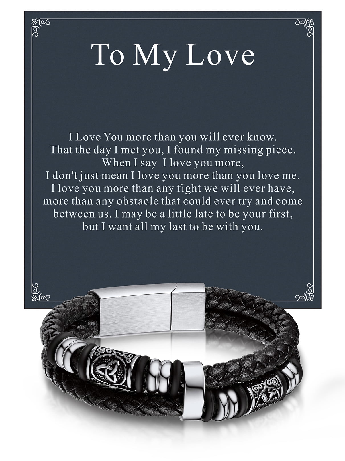 Bandmax 8.26'' Black Leather Bracelet for Men Double Wax Rope Cuff Norse Style Celtic Knot Beads Link Wristband Gift with Card for Son