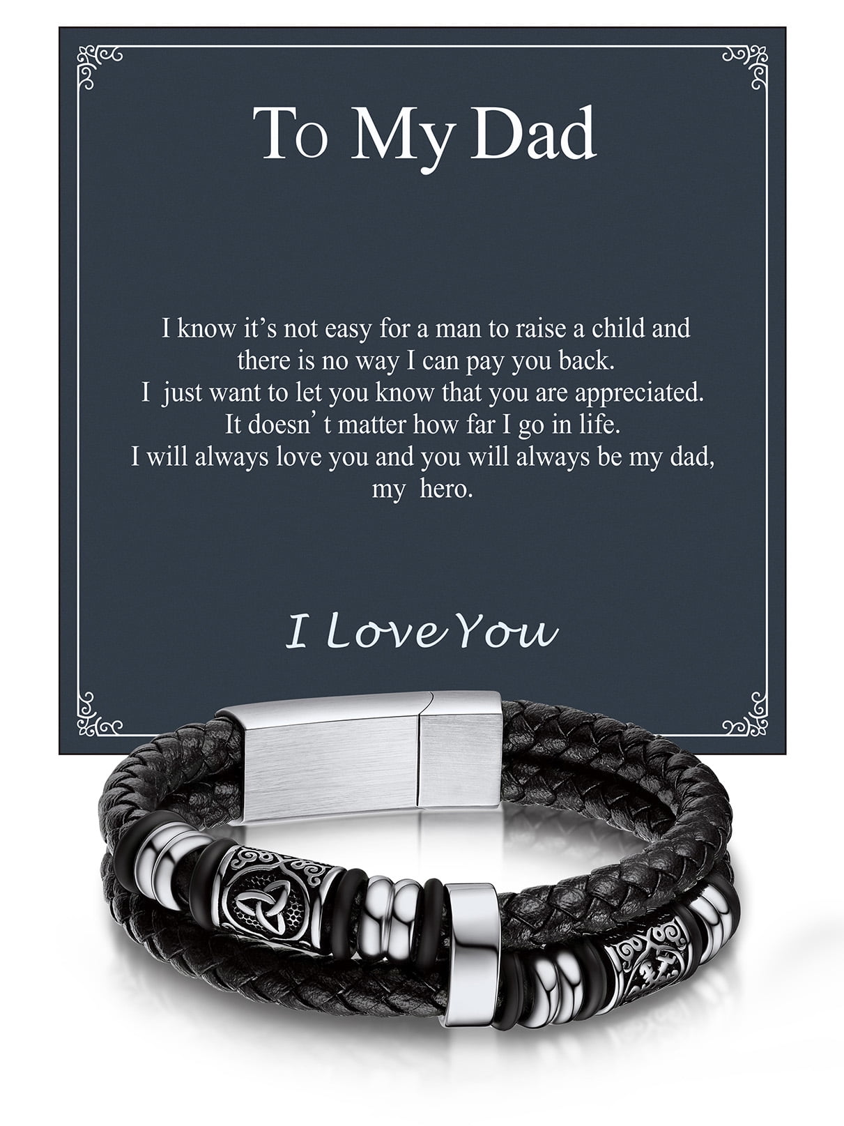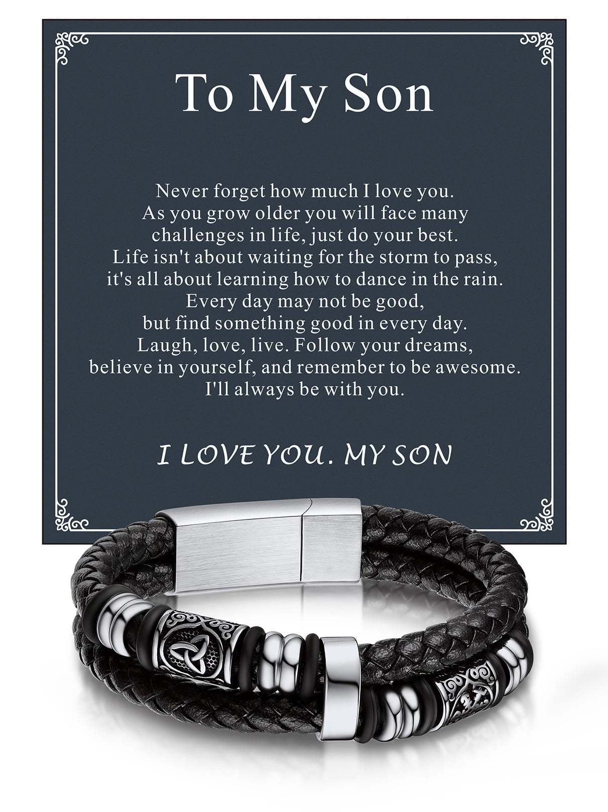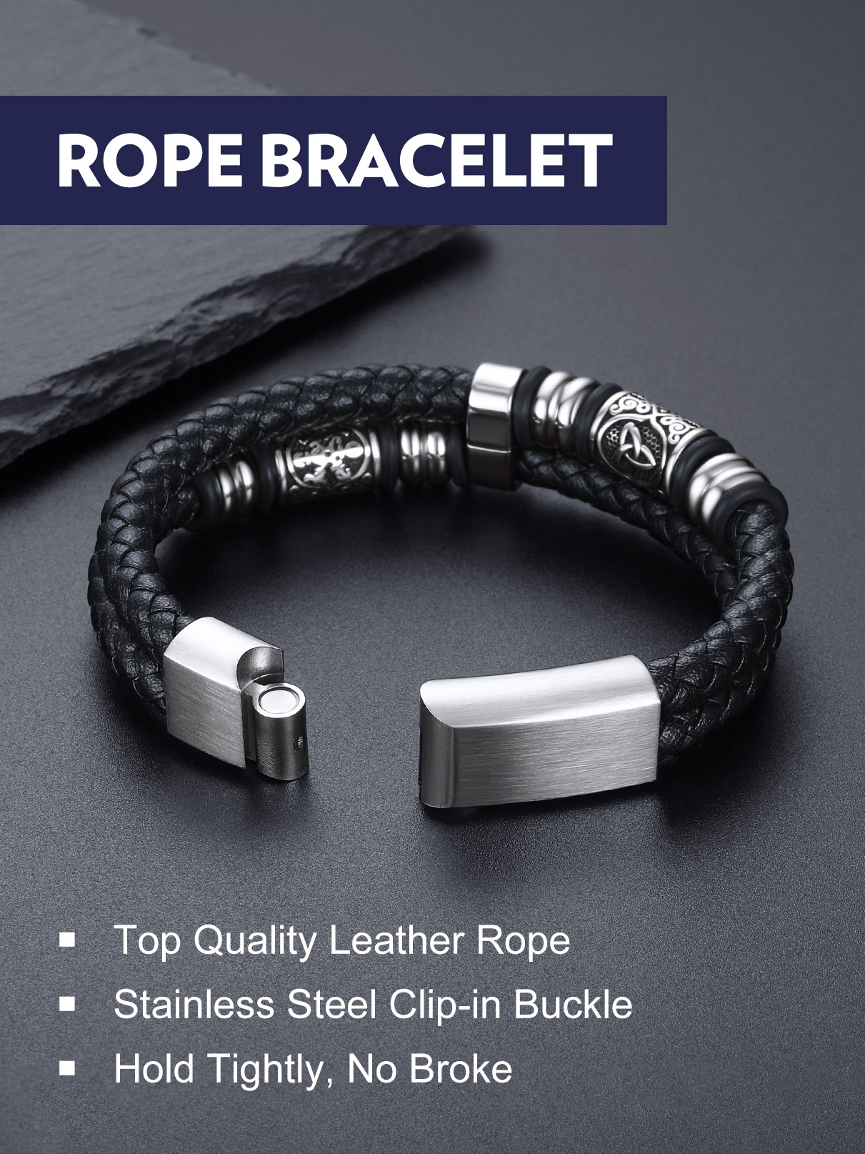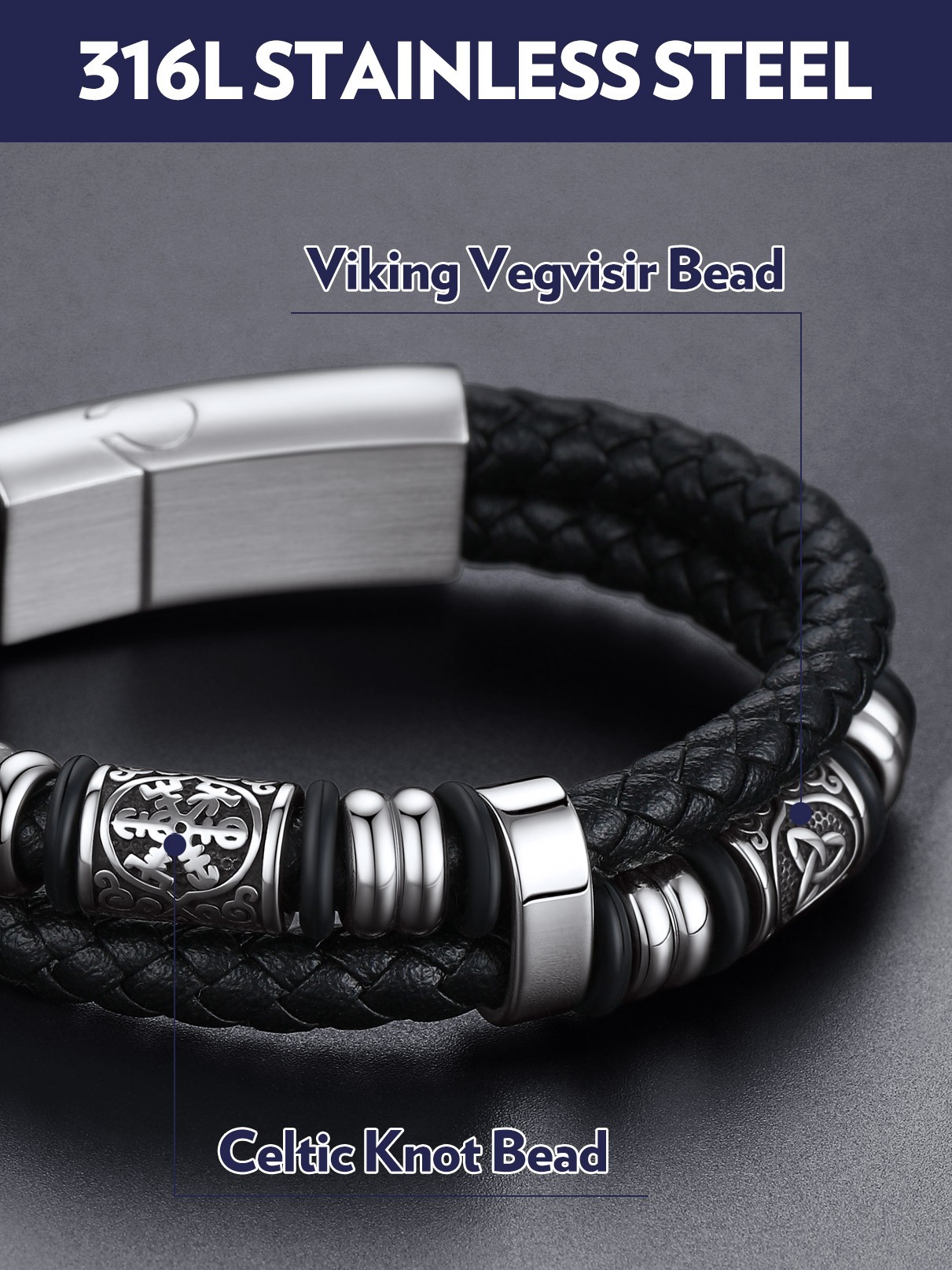 Bandmax 8.26'' Black Leather Bracelet for Men Double Wax Rope Cuff Norse Style Celtic Knot Beads Link Wristband Gift with Card for Son