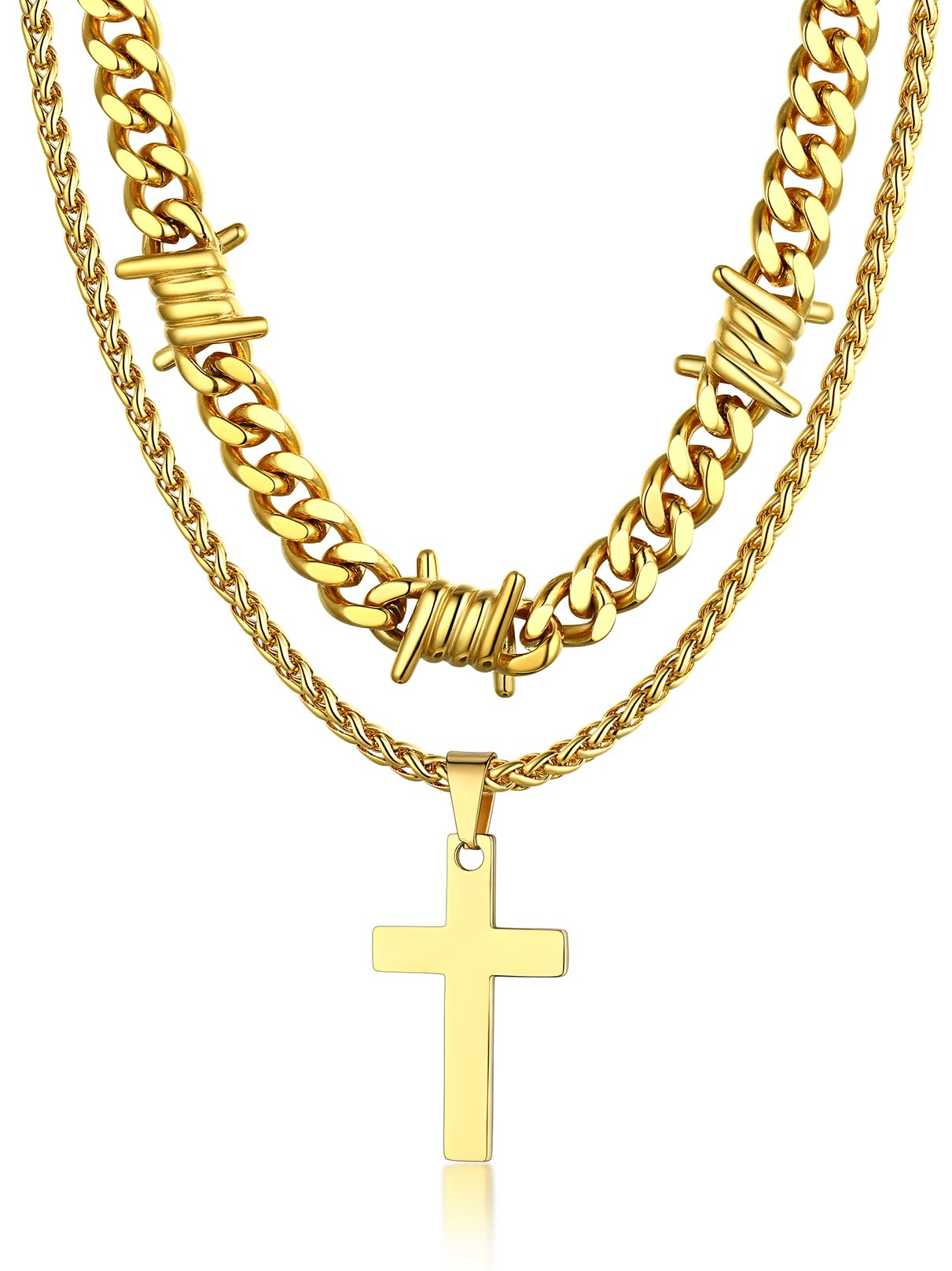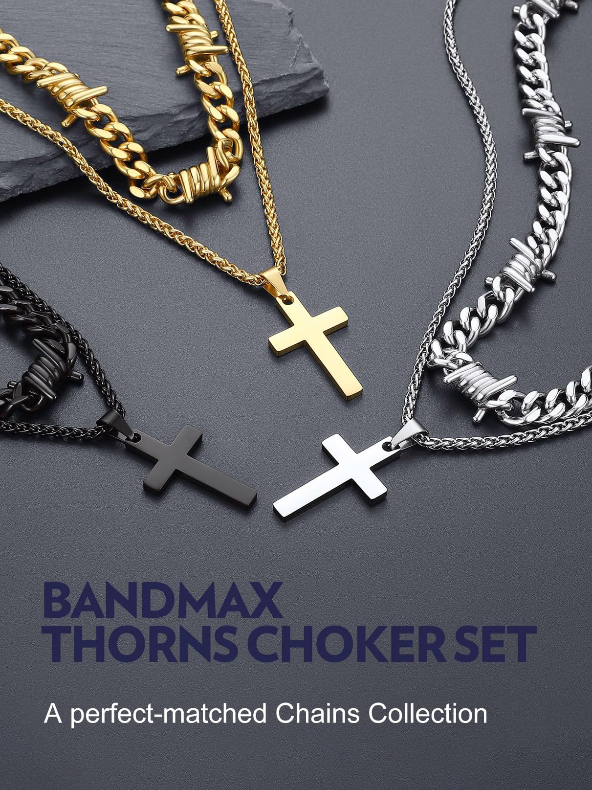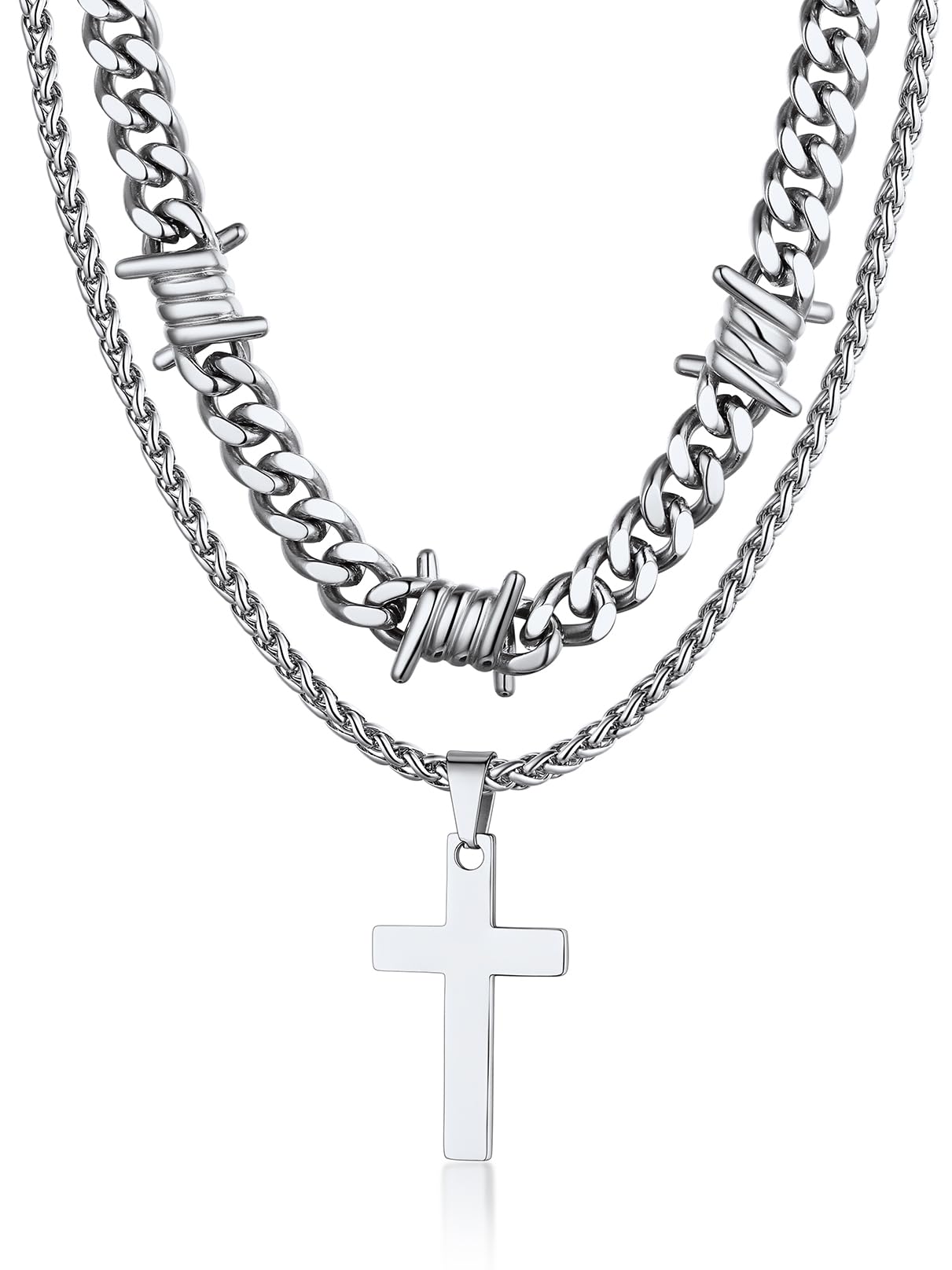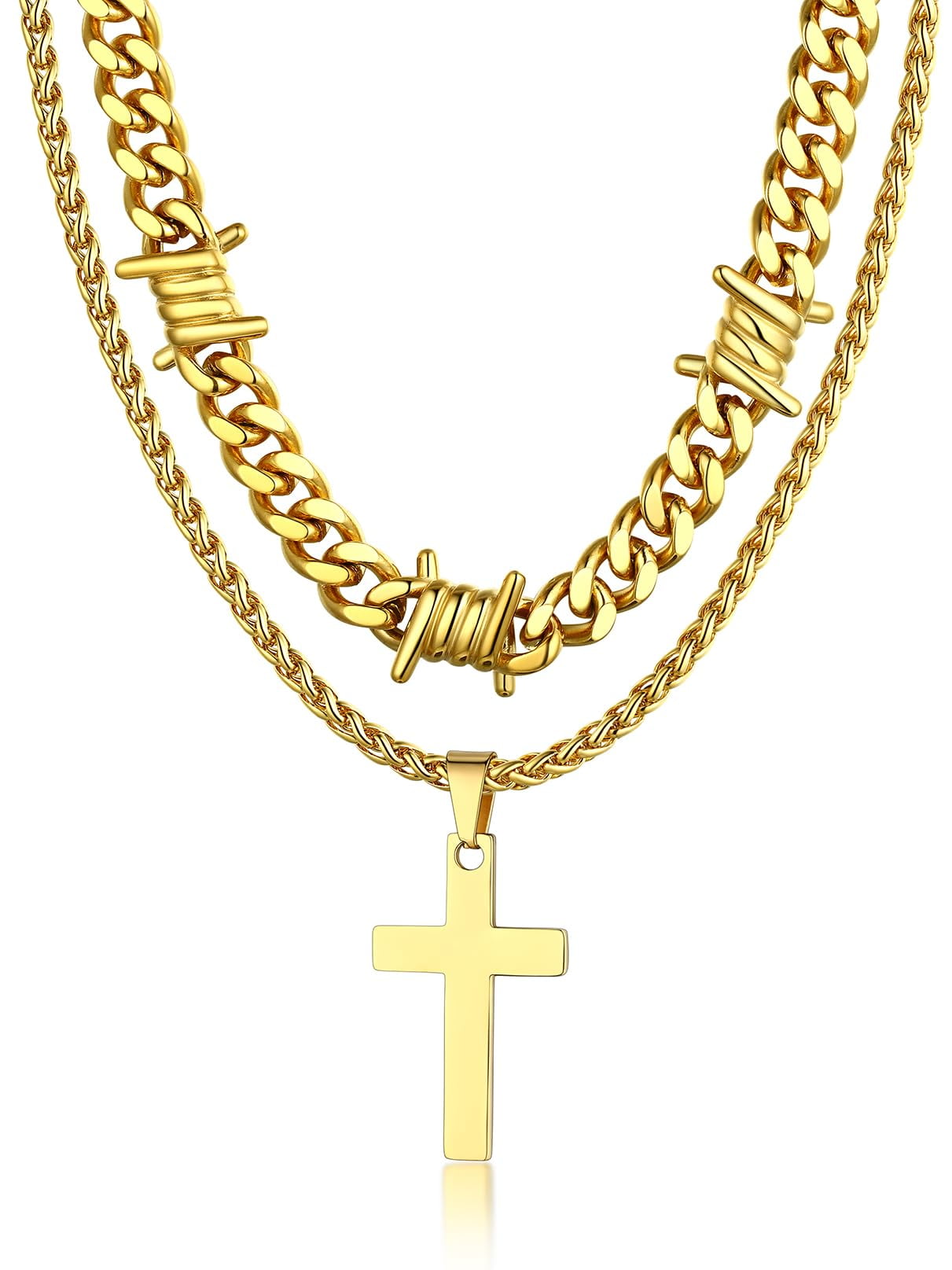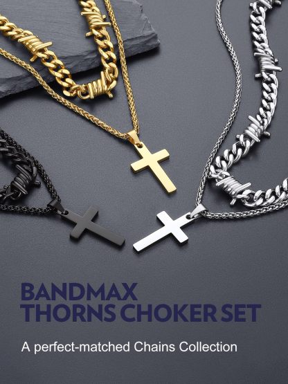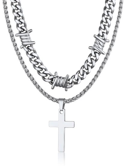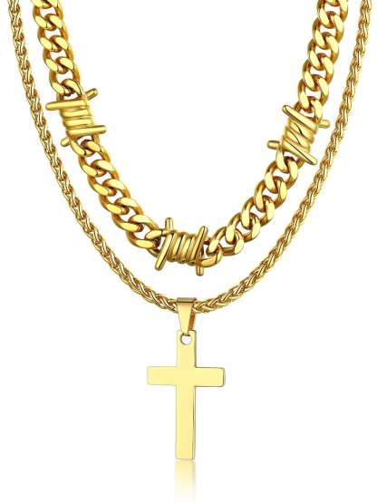 Our layering cross necklace set including a 16/20'' thorn cuban chain and a 22'' cross pendant necklace,creating a unique and eye-catching look.The different textures of the smooth cross and the rough - looking thorn chain add an interesting contrast, enhancing the overall aesthetic. The length of the two chains is carefully designed to fall at just the right points, flattering the neck and collarbone area.