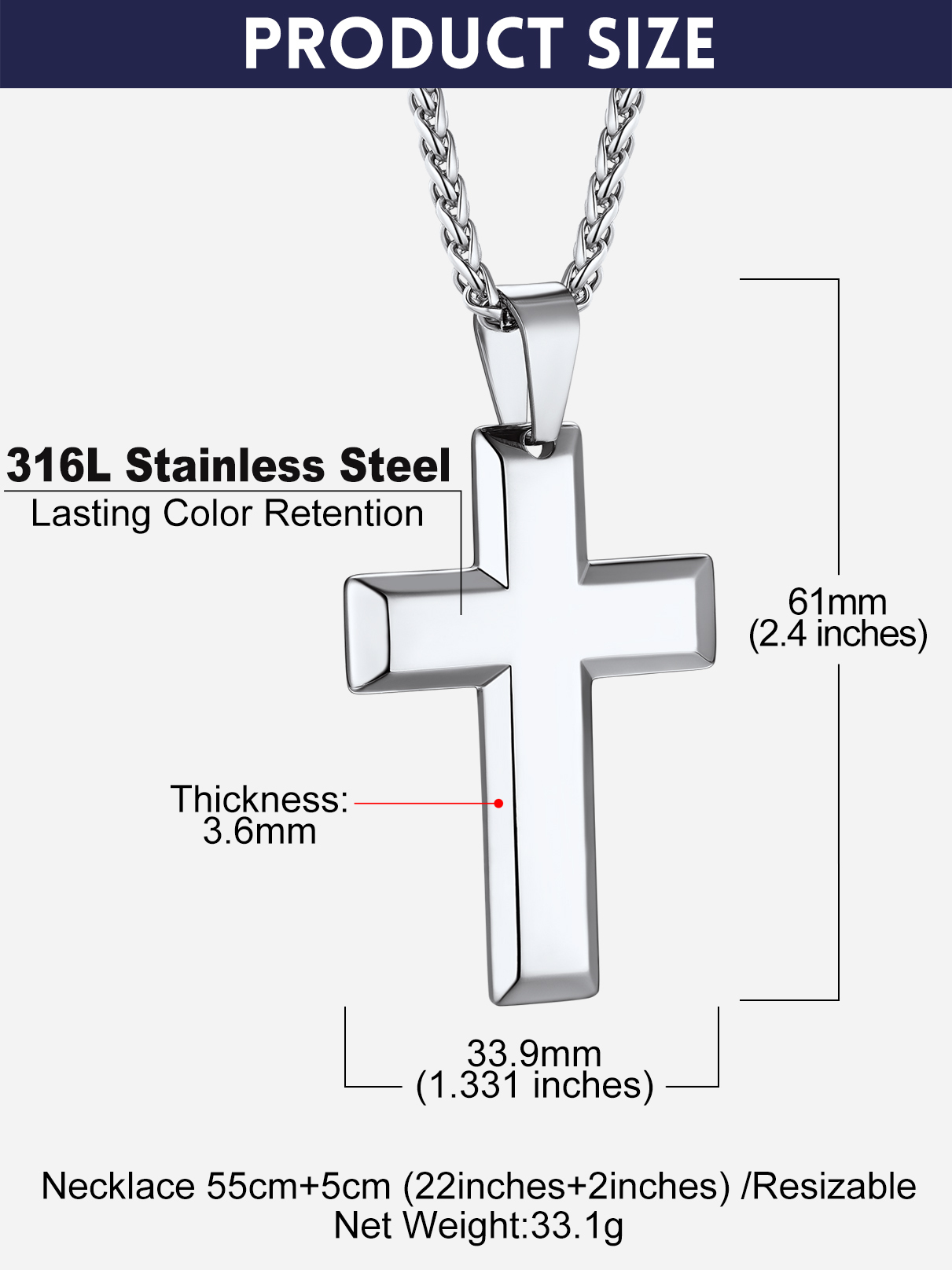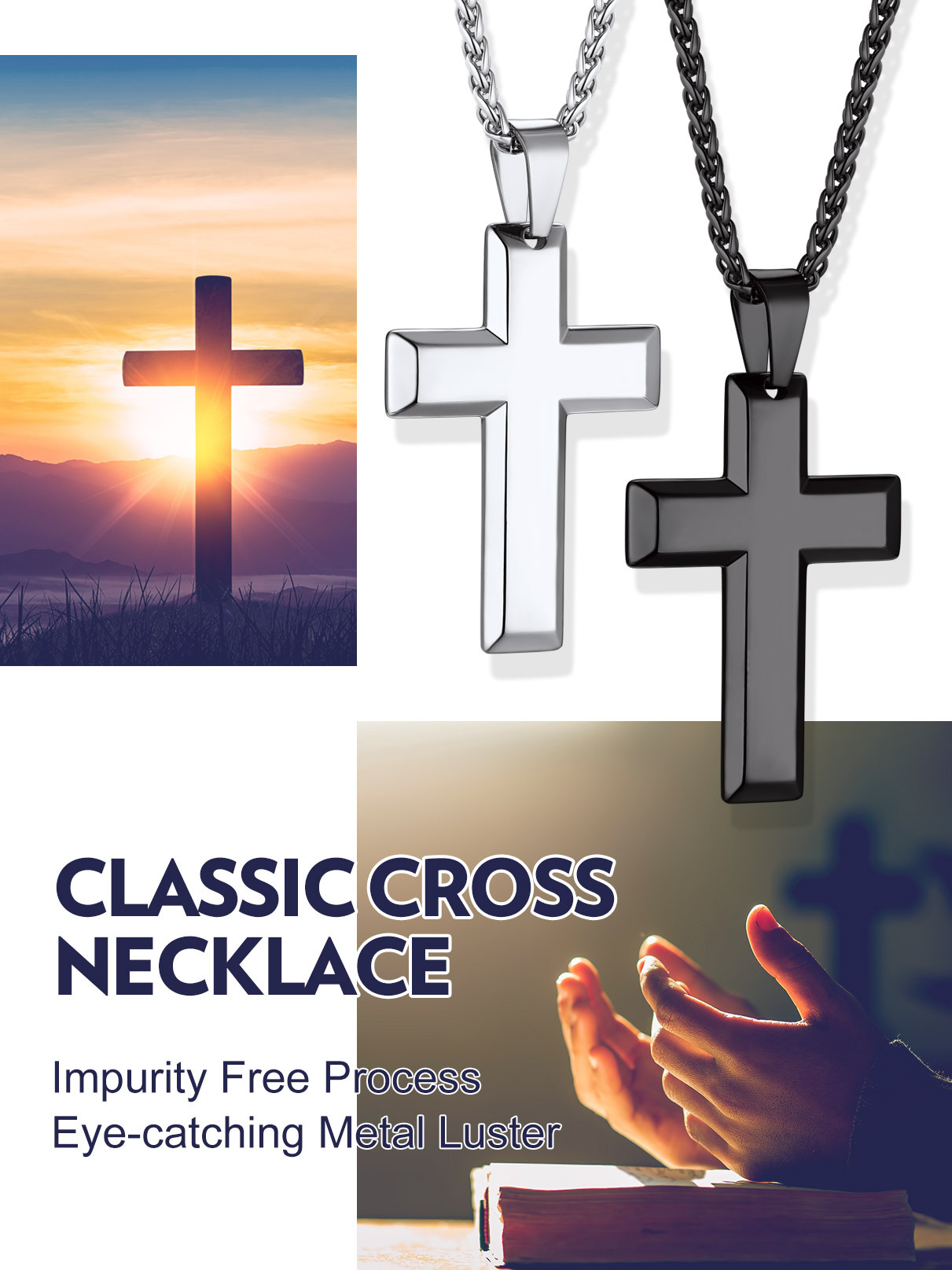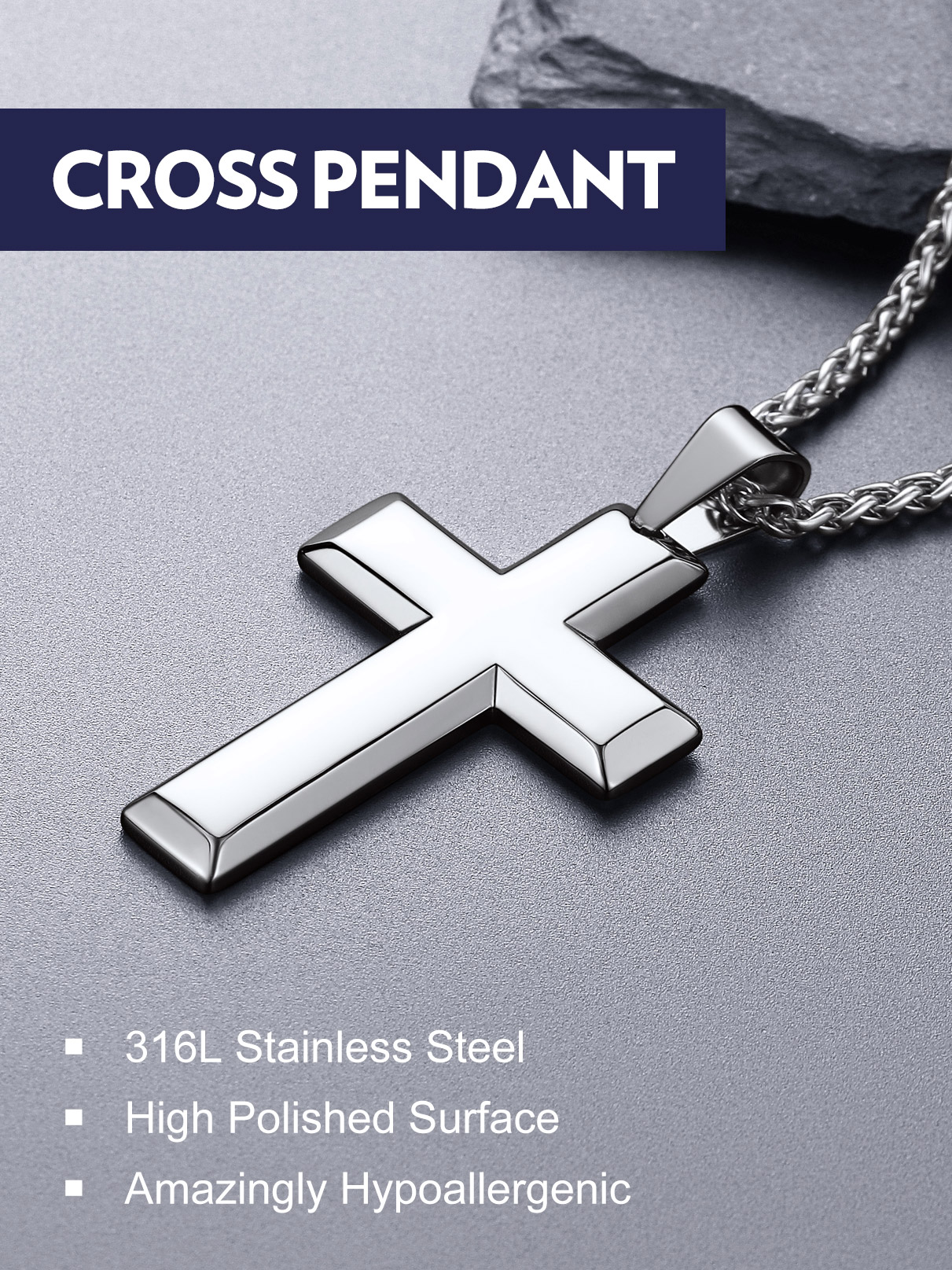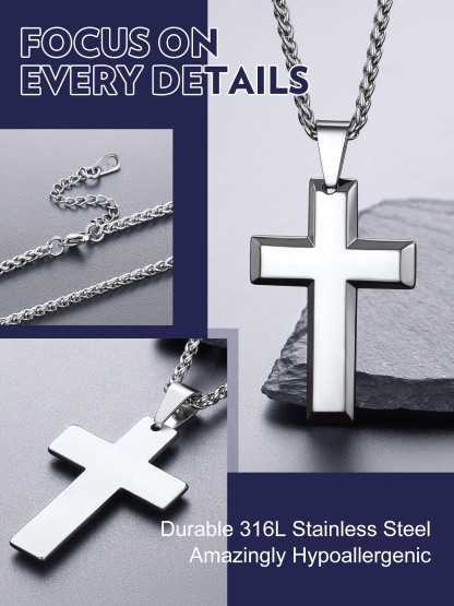 Our Cross pendant necklace made with 316L stainless steel,no color-fading, friendly to skin,hypoallergenic,with 2 colors to choose from.